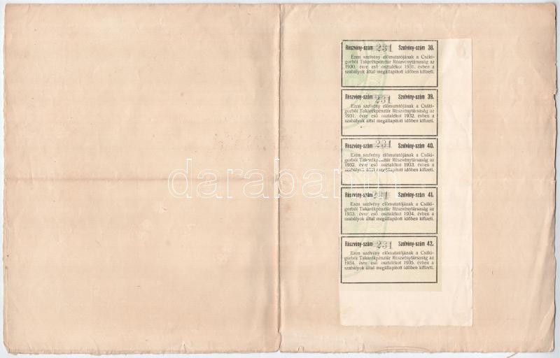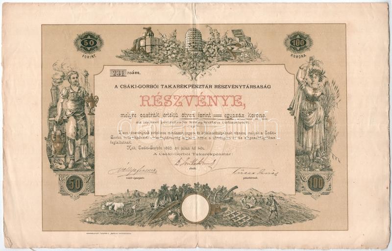 Csáki-Gorbó 1893. "Csáki-Gorbói Takarékpénztár" részvénye 50Ft-ról szárazpecséttel, hátlapra felragasztott néhány szelvénnyel T:III kis szakadások / Hungary / Csáki-Gorbó 1893. "Csáki-Gorbói Takarékpénztár (Savings Bank of Csáki-Gorbó)" share about 50 Forint with embosseb stamp, some coupons sticked on the back C:F small tears
