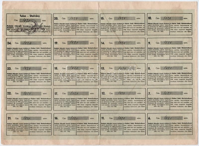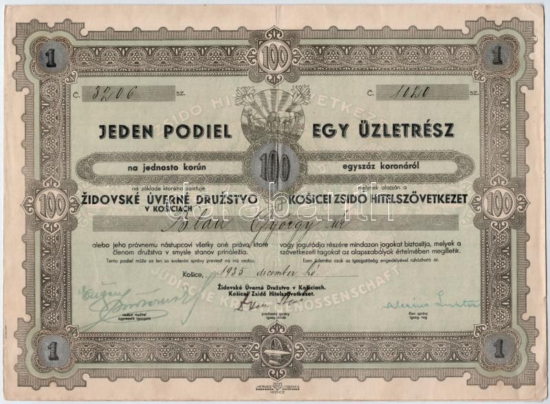 Csehszlovákia / Kassa 1935. "Kosicei Zsidó Hitelszövetkezet" névre szóló részvénye 100K-ról, kétnyelvű csehszlovák és magyar nyelven, szelvényekkel, bélyegzéssel T:II- / Czechoslovakia / Kosice 1935. "Kosicei Zsidó Hitelszövetkezet" share with bearer's name blingual czechslovakian and hungarian with coupons and overprint C:VF
