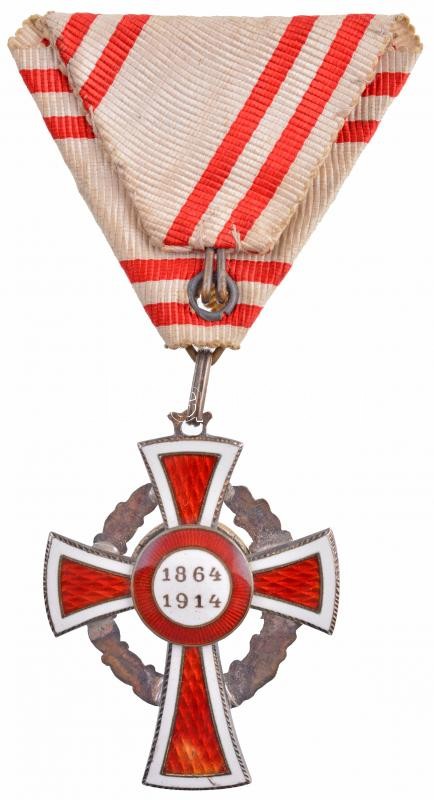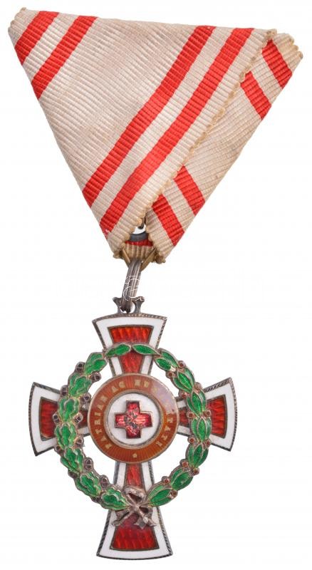 1914. "A Vörös Kereszt II. Osztályú Díszjelvénye hadidíszítménnyel" jelzett, zománcozott Ag kitüntetés mellszalagon T:2 zománchiba / Hungary 1914. "Red Cross, Badge of Honour, 2nd Class, with a war decoration" hallmarked, enamelled Ag decoration on ribbon C:XF enamel error