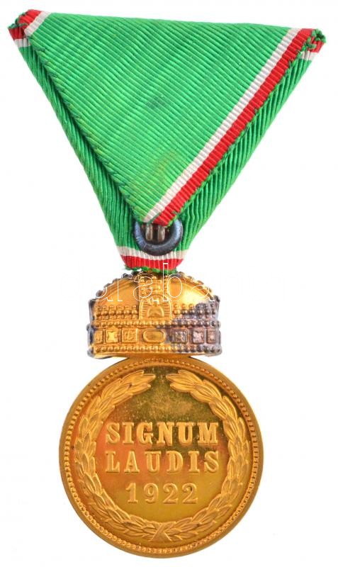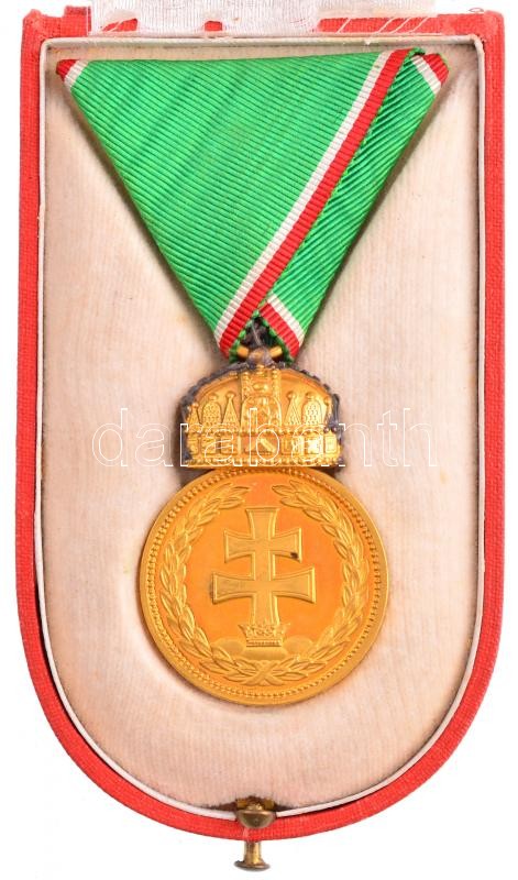 1922. "Magyar Koronás Bronzérem vörös-fehér szegélyezésű szalagon (katonai tagozat)" aranyozott bronz kitüntetés, fémjel nélküli, eredeti dísztokban! T:1- a korona szélein patina / Hungary 1922. "Hungarian Bronze Medal with the Holy Crown with red and white bordered ribbon (military deparment)" gilt bronze decoration without hallmark, with original case in good condition C:AU crown with patina