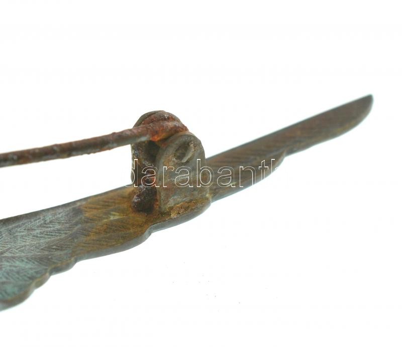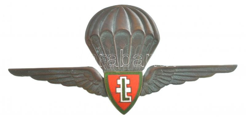 Beschreibung: ~1941-1944. "Ejtőernyős levente jelvény" ritka zománcbetétes bronz lemezjelvény (40x85mm) T:2 patina, zománchiba, tű rozsdás R! / Hungary ~1941-1944. "Levente qualification badge for paratroopers" rare bronze sheet metal badge with enamel inlay (40x85mm) C:XF patina, enamel error, rusty pin R!