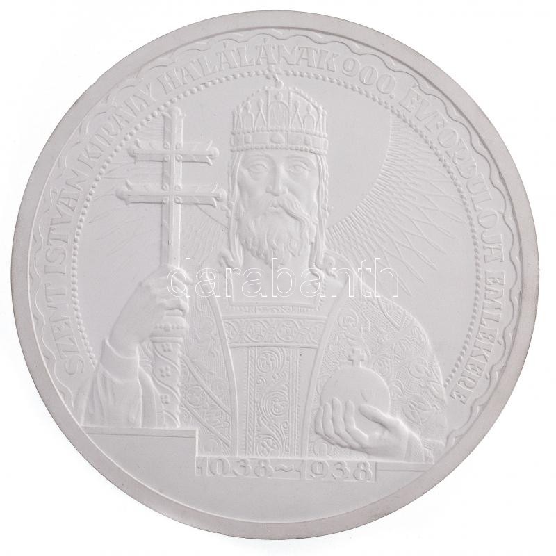 ~1938. "SZENT ISTVÁN KIRÁLY HALÁLÁNAK 900. ÉVFORDULÓJA EMLÉKÉRE 1038-1938" Feltehetően az 1938-as Szent István-évhez kötődő 5 Pengős érme tervpályázatára készült gipsz hátlapi nagyminta, Göröntsér Greff Lajos (1888-1976) pályaműve, hátoldalon "JELIGE: VÉSETT" jelzéssel. Adamovszky katalógus illetve egyéb szakirodalmi feldolgozása jelenleg nem ismert! (162mm) T:1,1- apró ph. RRR! / Hungary ~1938. "SZENT ISTVÁN KIRÁLY HALÁLÁNAK 900. ÉVFORDULÓJA EMLÉKÉRE 1038-1938" Likely the reverse of the entry to the 5 Pengő coin's designer competition submitted to the Saint Stephen's Year. Entry by Lajos Göröntsér Greff (1888-1976), the backside with "JELIGE: VÉSETT (Code word: Engraved)". At this time the pieces isn't mentioned in any related works (162mm) C:AU,XF tiny edge error RRR!