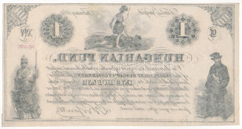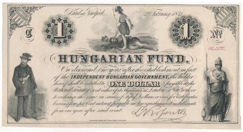 1852. 1$ "C" "Kossuth bankó" piros "22705" sorszámmal, nyomdai papírránccal és papírráncból eredő nyomathibával T:I- / Hungary 1852. 1 Dollar "C" "Hungarian Fund" with red "22705" serial number, with paper crease and printing error by paper crease C:AU
