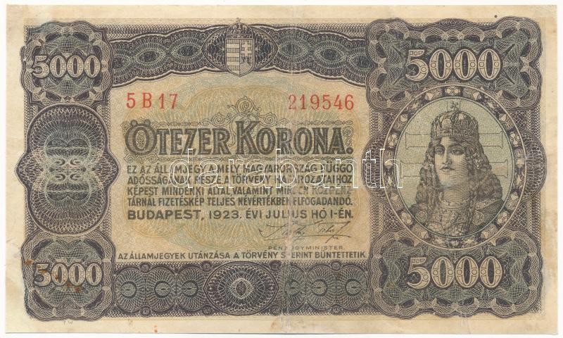 1923. 5000K nyomdahely jelölés nélkül, "5B17 219546" T:III r... https://www.darabanth.com/de/38-Gross-Auktion/38.1/Numismatik/Ungarische-und-Auslandische-Banknoten~15627/1923-5000K-nyomdahely-jeloles-nelkul-5B17-219546-TIII-restauralt-Hungary-1923-5000-Koro~II2612381