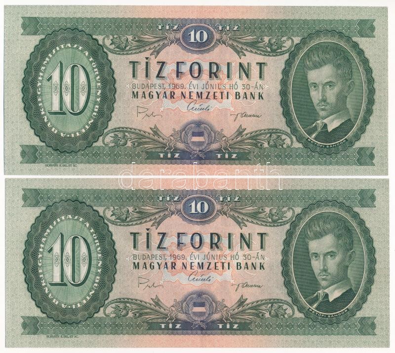 Beschreibung: 1969. 10Ft (2x) sorszámkövetők "A 701 091851 - A 701 091852" T:I / Hungary 1969. 10 Forint (2x) consecutive serials ""A 701 091851 - A 701 091852" C:UNC