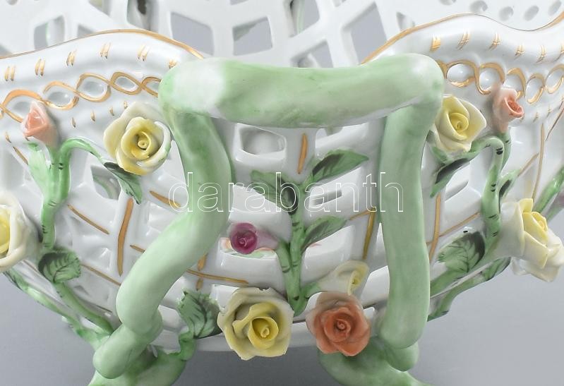 Beschreibung: Herendi II. osztály, nagy méretű, gyümölcskínáló, áttört porcelán, plasztikus rózsákkal, rózsákon apró lepattanás, jelzett, 40x26x15cm