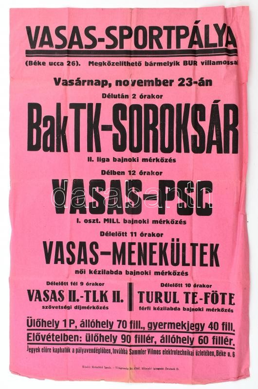 cca 1930 A BAK TK - Soroksár II. liga futball bajnoki mérkőzés + Vasas... https://www.darabanth.com/de/38-Gross-Auktion/38.1/Poster/Poster~15594/cca-1930-A-BAK-TK-Soroksar-II-liga-futball-bajnoki-merkozes-plus-Vasas-PSC-merkozes-plakatj~II2610960