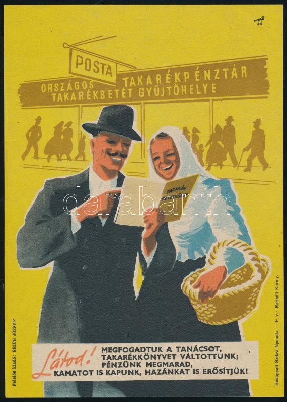 cca 1950 Országos Postatakarékpénztár takarékkönyv propaganda kisplaká... https://www.darabanth.com/de/38-Gross-Auktion/38.1/Poster/Poster~15594/cca-1950-Orszagos-Postatakarekpenztar-takarekkonyv-propaganda-kisplakat-19-5C39713-5-cm~II2612116