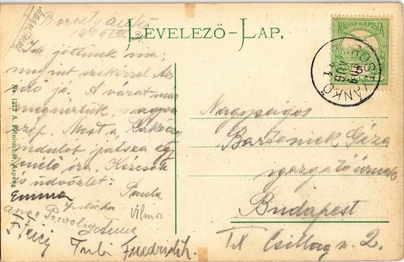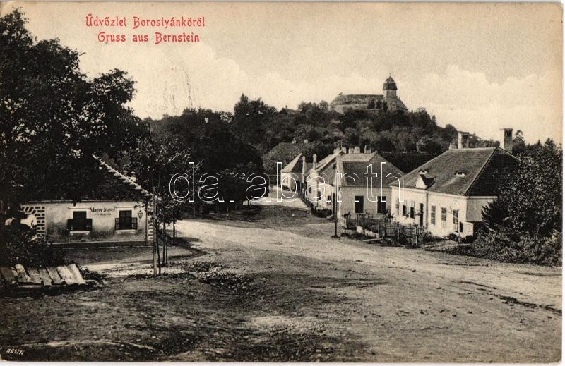 1909 Borostyánkő, Bernstein; Máger József vegyeskereskedése, vár a háttérben. A. Pelnitschar kiadása / Schloss, Geschäft, Strasse / shop and castle, street
