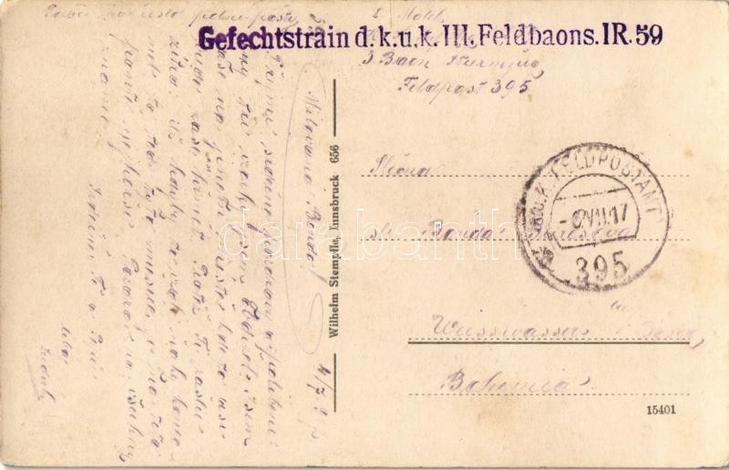 Beschreibung: 1917 Scharnitz (Tirol), Mittenwaldbahn / Mittenwald Railway, train + "Gefechtstrain d. k.u.k. III. Feldbaons IR. 59." (EK)