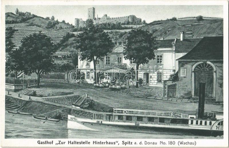 Beschreibung: 1931 Spitz an der Dunau (Wachau), Gasthof "Zur Haltestelle Hinterhaus" / inn, hotel, castle, steamship