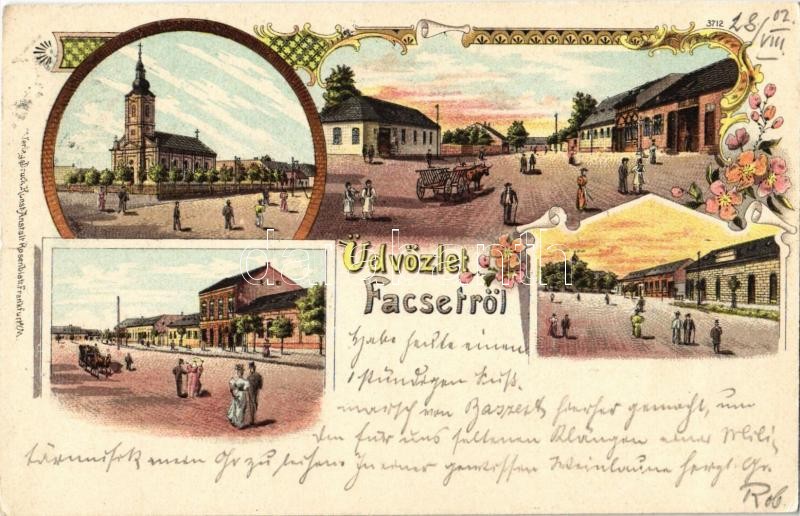 Beschreibung: 1902 Facset, Facsád, Faget; templom, Fő tér és utca / church, main square and street. Kunstanstalt Rosenblatt Art Nouveau, floral, litho