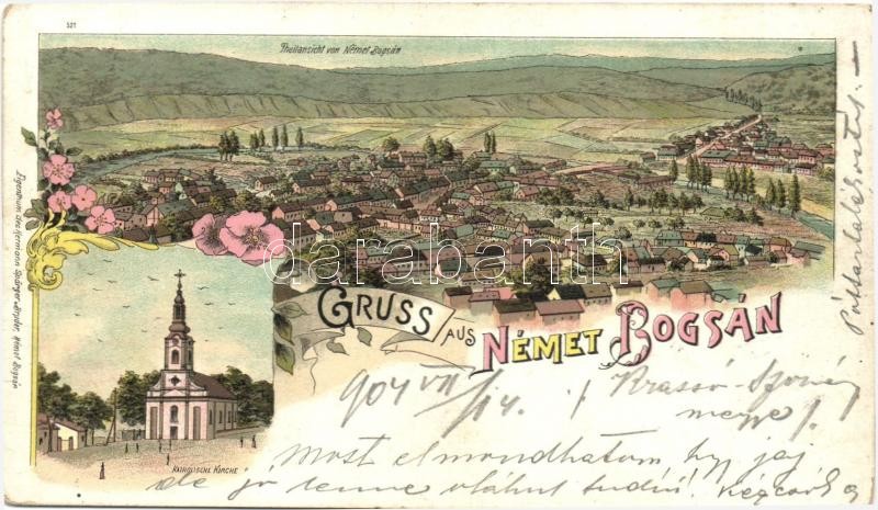 Beschreibung: 1904 Boksánbánya, Németbogsán, Bocsa; katolikus templom. Hermann Spräger és fiai kiadása / church. Art Nouveau, floral, litho (EK)