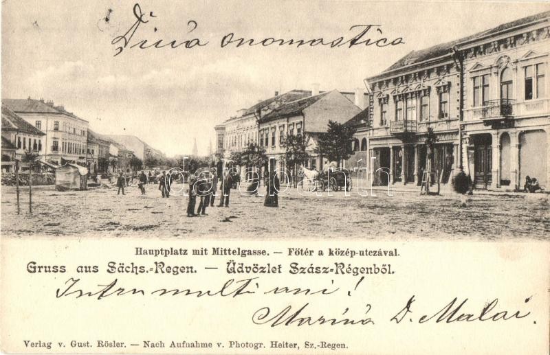 1904 Szászrégen, Reghin; Hauptplatz mit Mittelgasse. Verlag v. Gust. Rösler, Photogr. Heiter / Fő tér a Közép utcával, piaci árusok, üzletek, létra / main square, market vendors, street view, shops, ladder