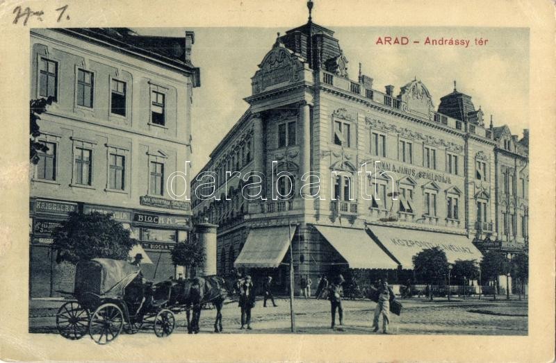 Arad, Andrássy tér, Rónai A. János szállodája, Központi Kávéház, Kriegler és Lázár Gyula üzlete, Bloch H. könyvnyomdája és saját kiadása / square, hotel, cafe, shops (Rb)