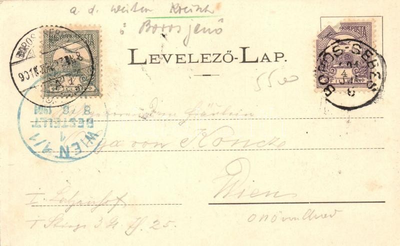 Beschreibung: Borossebes, Sebis; Hősök emléke, Piac tér templommal és Steiner Samu üzletével. Honisch fényképész felvétele / monument, market square, church, shop, floral, Art Nouveau