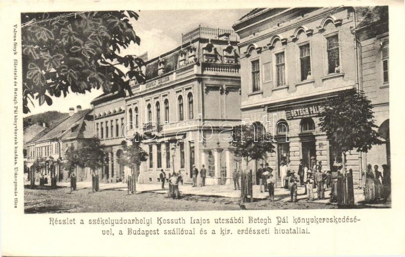 Székelyudvarhely, Odorheiu Secuiesc; Kossuth Lajos utca, Budapest szálló, Kir. erdészeti hivatal, Betegh Pál könyvkereskedése és saját kiadása. Valena fényképész fölvétele / street view with hotel, forestry office and book shop (EK)