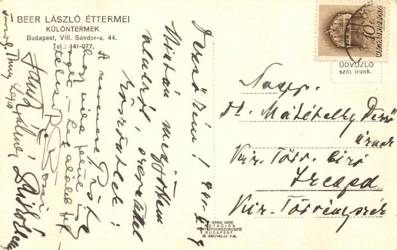 1941 Budapest VIII. Beer László étterem. Sándor utca 44. https://www.darabanth.com/de/381-Fernauktion/381.0/Ansichtskarten/Ungarn~1500004/1941-Budapest-VIII-Beer-Laszlo-etterem-Sandor-utca-44~II1776828