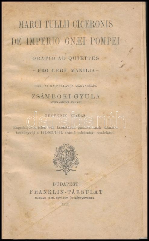 Marci Tullii Ciceronis de Imperio Gnaei Pompei. Oratio ad Quirites. Is... https://www.darabanth.com/de/381-Fernauktion/381.0/Bucher/Bucher-Andere-kuriositaten~1000018/Marci-Tullii-Ciceronis-de-Imperio-Gnaei-Pompei-Oratio-ad-Quirites-Iskolai-hasznalatra-magyarazta~II2038730