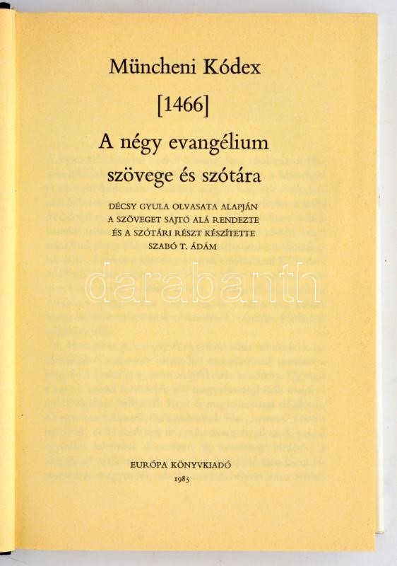 A Müncheni Kódex négy evangéliuma. [1466.] Müncheni Kódex [1466.] A négy evangélium szövege és szótára. Décsy Gyula olvasata alapjén a szöveget sajtó alá rendezte és a szótári részt készítette Szabó T. Ádám. Az előszót Király László írta. Bp.,1985, Európa. Kiadói egészvászon-kötés, kiadói papír védőborítóban.