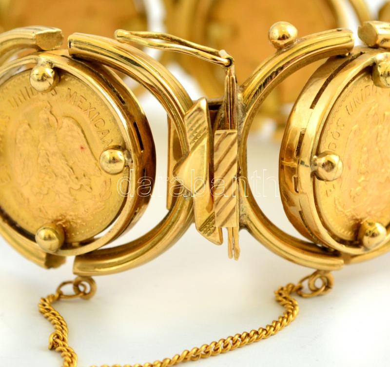 Beschreibung: Arany (Au) 18K karkötő, 6 db Mexikó 1955. 5P Au "Miguel Hidalgo y Costilla" utánveret (4.18g/0.900) érmékkel, jelzett, össz nettó: 70 g