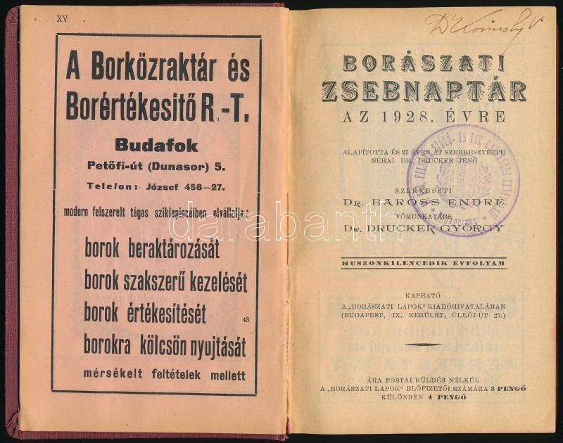 1928 Borászati zsebnaptár, egészvászon kötésben, 282p https://www.darabanth.com/de/381-Fernauktion/381.0/Kunst-Dokumente-andere-Sammelgebiete/Drucksachen~500036/1928-Boraszati-zsebnaptar-egeszvaszon-kotesben-282p~II2262099
