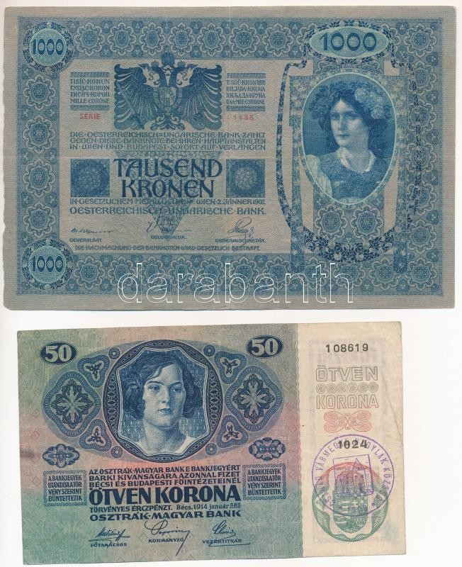 1902. 1000K + 1914. 50K, mindkettő hamis "Csanád Vármegye Nagylak... https://www.darabanth.com/de/381-Fernauktion/381.0/Numismatik/Ungarische-Banknoten~2000007/1902-1000K-plus-1914-50K-mindketto-hamis-Csanad-Varmegye-Nagylak-Kozseg-1908-felulbelyegze~II2149781