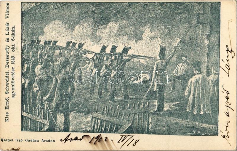 1902 Kiss Ernő, Schweidel, Dessewffy és Lázár Vilmos agyonlövetése 1849 október 6-án, Magyar szabadságharc. Kerpel Izsó kiadása Aradon / Hungarian Revolution of 1848 art postcard