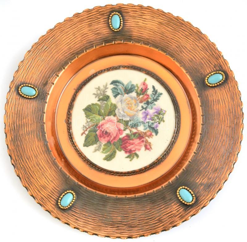 Beschreibung: Vörösréz fali tál, a szélein türkiz berakással, a közepén gobelin berakással, d: 30 cm