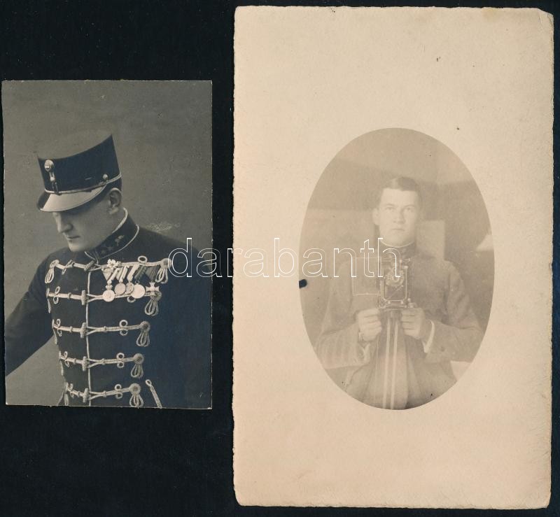 cca 1900-1910 Vegyes katonafotó tétel, 4 db, közte egy 'fotós' katonával, fotó, fotólap és keményhátú fotó, a keményhátú fotó körbevágott, 19x10 cm és 9x5 cm közötti méretben.