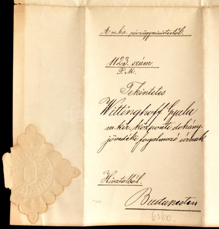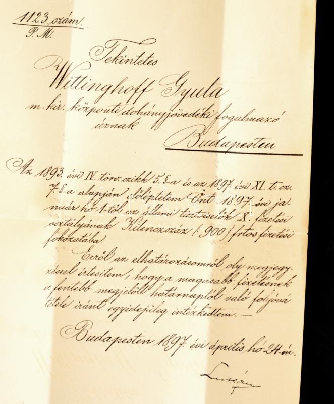 1897 Wiettinghof Gyula (1867-1909) m. kir. központi dohányjövedéki igazgatósági fogalmazó előléptetési és fizetési besorolási értesítése, Lukács László (1850-1932) pénzügyminiszter (1895-1905) aláírásával, szárazpecséttel Jó állapotban.
