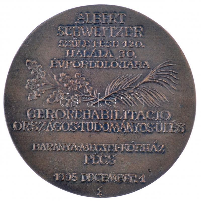 Soltra Elemér (1922-2013) 1995. "Albert Schweitzer születése 120., halála 30. évfordulójára - Gerorehabilitáció Országos Tudományos Ülés - Baranya megyei Kórház Pécs 1995. december 1. / "Tisztelet az életben lévővel szemben és határta-lan felelős-ség mind-azért ami él" Albert Schweitzer" Br emlékérem (104mm) T:1-,2