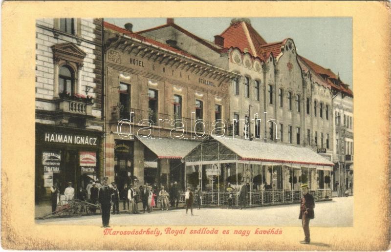 Marosvásárhely, Targu Mures; Royal szálloda és nagy kávéház, Haiman Ignác és Stausz József üzlete. Tulajdonos Stausz József / hotel and cafe and shops (EK)