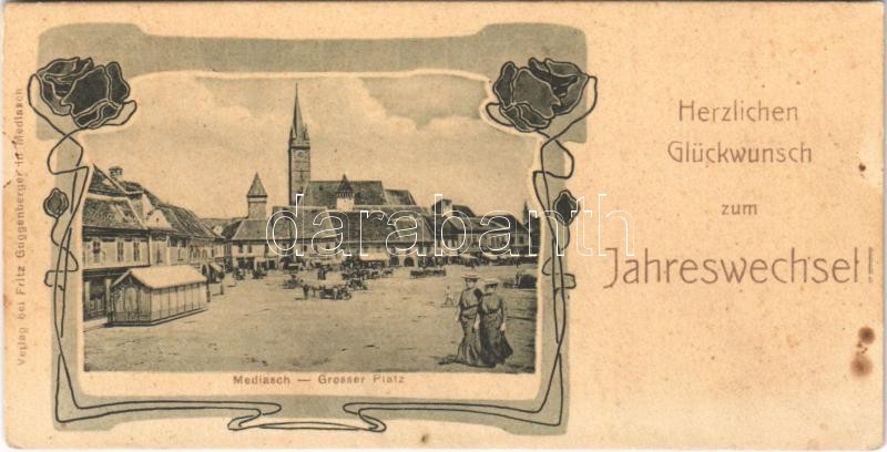 Medgyes, Mediasch, Medias; Nagy tér. Újévi üdvözlet, Fritz Guggenberger kiadása / Grosser Platz. Herzlichen Glückwunsch zum Jahreswechsel / square, New Year greeting. Art Nouveau, mini card (12 x 6 cm) (non PC) (fl)