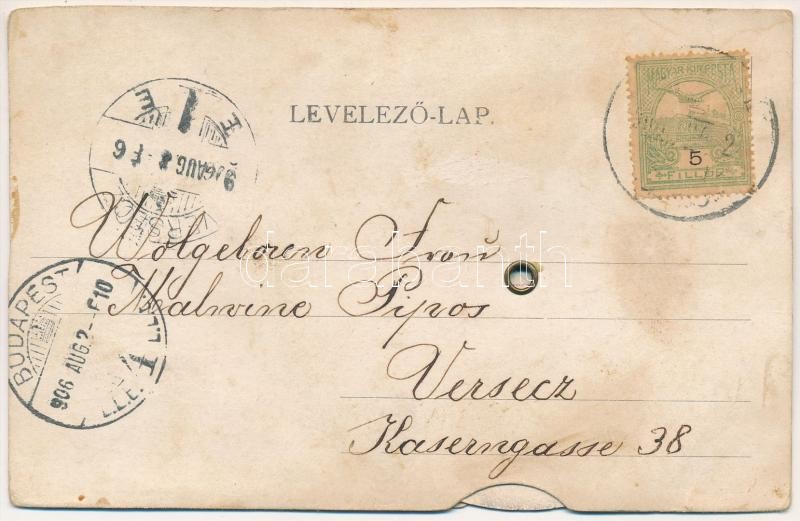 Beschreibung: 1906 Budapest VII. Király utca, Király színház. Tekerhető mechanikus lap magyar színésznőkkel (Rb)