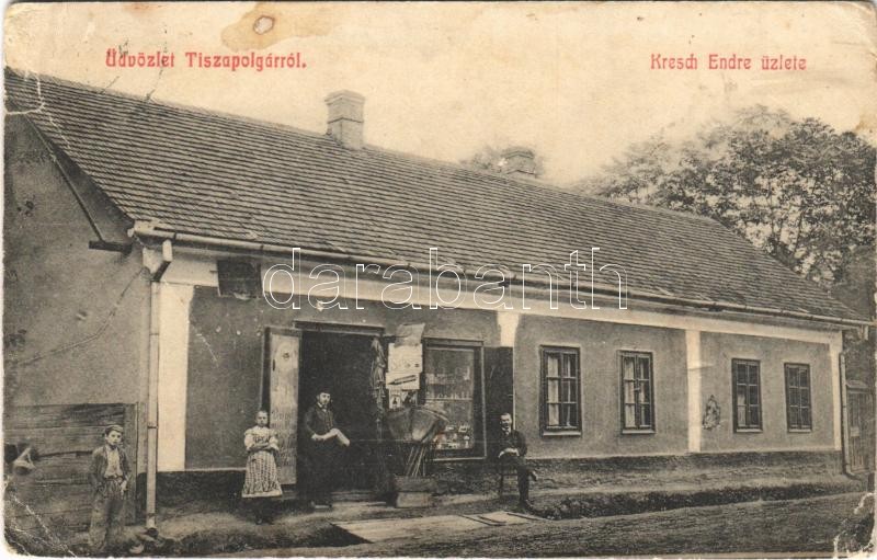 1912 Polgár, Tiszapolgár; Kresch Endre üzlete (Rb) https://www.darabanth.com/de/385-Fernauktion/385.0/Ansichtskarten/Ungarn~500005/1912-Polgar-Tiszapolgar-Kresch-Endre-uzlete-Rb~II2304588