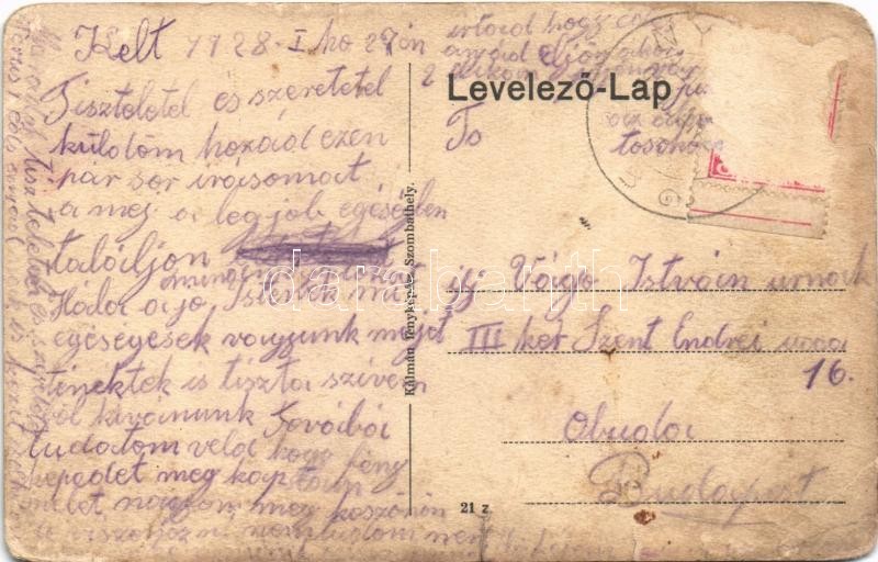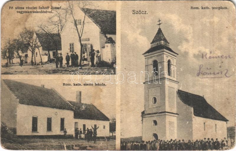 Beschreibung: 1928 Szőc (Veszprém), Római katolikus templom és elemi iskola, Fő utca, Inhoff József vegyeskereskedése (szakadások / tears)