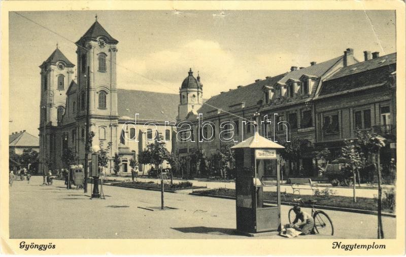 1939 Gyöngyös, Nagytemplom, távbeszélő, telefönfülke, kerékpár (EB) https://www.darabanth.com/de/385-Fernauktion/385.0/Ansichtskarten/Ungarn~500005/1939-Gyongyos-Nagytemplom-tavbeszelo-telefonfulke-kerekpar-EB~II2306205
