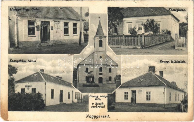 Beschreibung: 1941 Nagygeresd, Községháza, Evangélikus iskola, templom és lelkészlak, Hősök szobra, emlékmű, Hangya Szövetkezet üzlete és saját kiadása (EM)