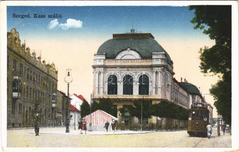 Beschreibung: 1944 Szeged, Hotel Kass szálloda, villamos. Traub B. és Társa kiadása (EK)