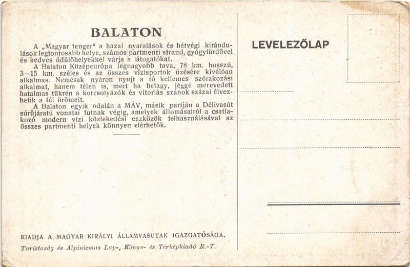 Beschreibung: Balaton, Turisztikai reklám a hátoldalon. Kiadja a Magyar Királyi Államvasutak Igazgatósága s: Wágner (EK)