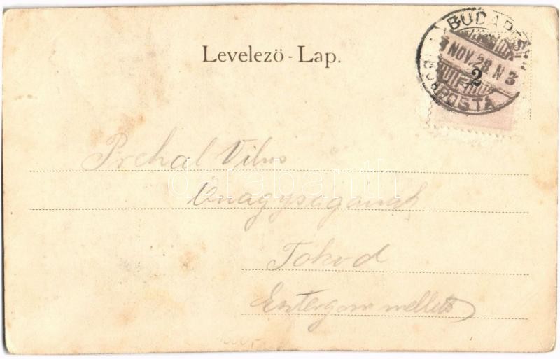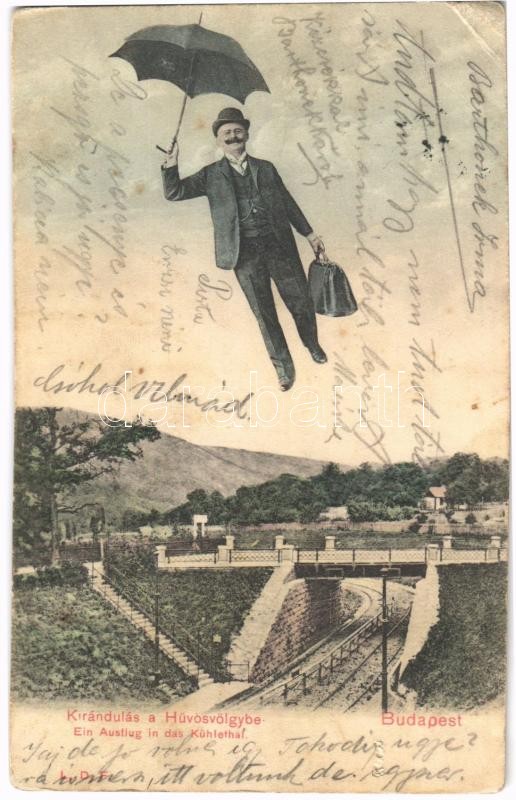 Beschreibung: Budapest II. Hűvösvölgy, Kirándulás a Hűvösvölgybe, villamos felüljáró. Montázs esernyővel repülő úriemberrel (EK)