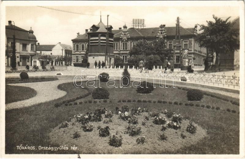 Beschreibung: Tata, Tata-Tóváros; Országgyűlés tér, Harangláb, cukrászda, Mohácsy Aladár üzlete