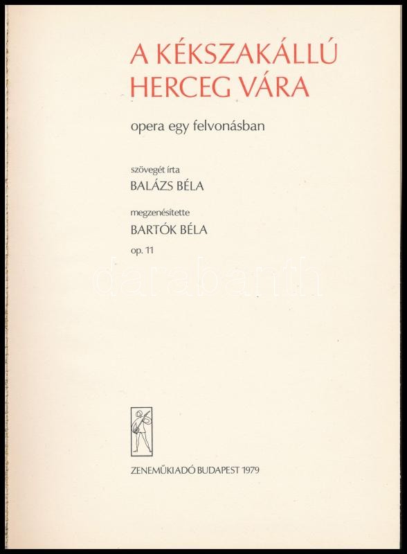 Balázs Béla-Bartók Béla: A kékszakállú herceg vára. Opera egy felvonásban. Bp.,1979, Zeneműkiadó. Kiadói aranyozott nyl-kötés, kiadói javított papír védőborítóban. Megjelent 5700 példányban.