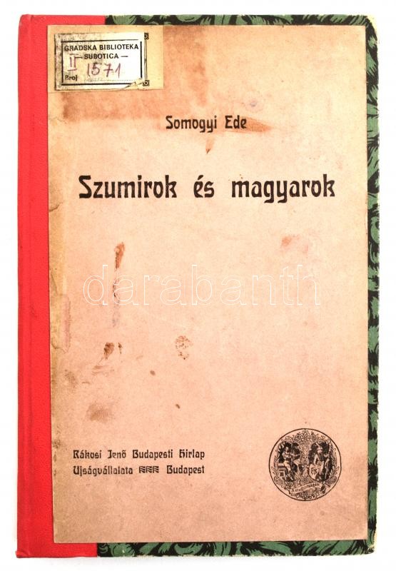 Somogyi Ede: Szumirok és magyarok. Budapest, 1903, Rákosi Jenő Budapesti Hírlap Újságvállalata, 2+270+1. Modern félvászon kötésben, az eredeti papírborító felhasználásával