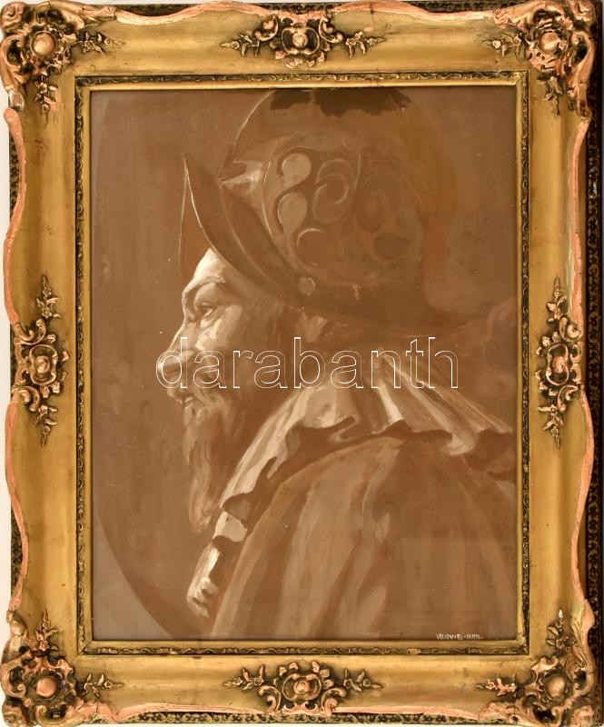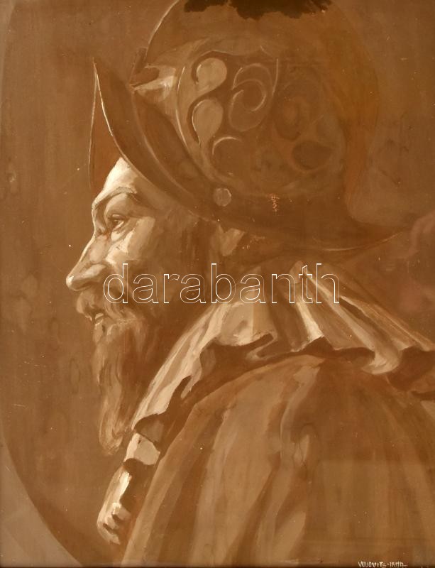 Beschreibung: Vujovits (Vujovich) Irma (1898-1977), a nagybányai szabadiskolát látogatta 1918-ban: Alabárdos. Olajtempera, papír, jelzett, kissé sérült. Üvegezett, javított fa keretben, 53,5×43 cm