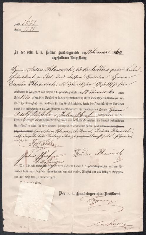 1860 Pesti cégbíróság, Anton Blasovich és Eduard Blasovich között kötött üzleti szerződés aláírásaikkal, papírfelzettel, lap alján egy Lechner n. személy aláírásával, foltos, lap alján hajtásnyom mentén szakadással