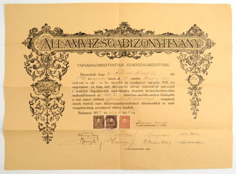 1932 Bp., Társadalombiztosítási szakvizsgabizottság által kibocsátott ... https://www.darabanth.com/de/385-Fernauktion/385.0/Kunst-Dokumente-andere-Sammelgebiete/Dokument~1000017/1932-Bp-Tarsadalombiztositasi-szakvizsgabizottsag-altal-kibocsatott-allamvizsga-bizonyitvC3~II2302065