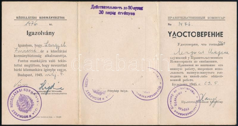 1945 Bp., Közellátási kormánybiztos igazolvány https://www.darabanth.com/de/385-Fernauktion/385.0/Kunst-Dokumente-andere-Sammelgebiete/Dokument~1000017/1945-Bp-Kozellatasi-kormanybiztos-igazolvany~II2301274