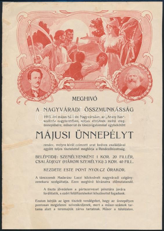 Beschreibung: 1913 Szeghalom, Szeghalmi Függetlenségi 48-as Kör hazafias népünnepély meghívója, 1913. máj. 15., a túloldalán: Nagyvárad, Nagyváradi Összmunkásság májusi ünnepélyének meghívója, 1913. máj. 1., Arany Sas szálloda nagyterme, javított.